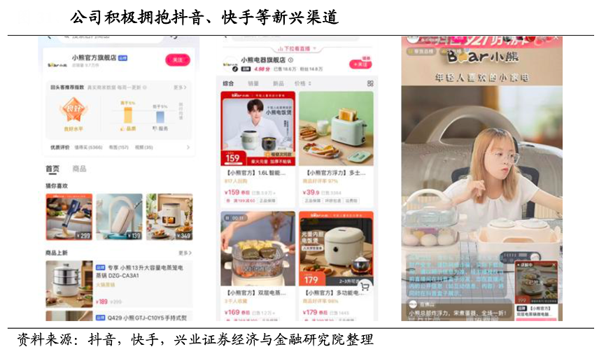 經(jīng)典案例:根據(jù)抖音、快手、興業(yè)證券經(jīng)濟(jì)與金融研究院等綜合資訊表明,近年抖音、快手等新興渠道崛起,小熊公司緊跟時(shí)勢開始積極布局,在抖音、快手等平臺商設(shè)置旗艦店,截至 2022 年 11 月,抖音平臺小熊 電器官方旗艦店已擁有 165 萬粉絲,獲贊83w。