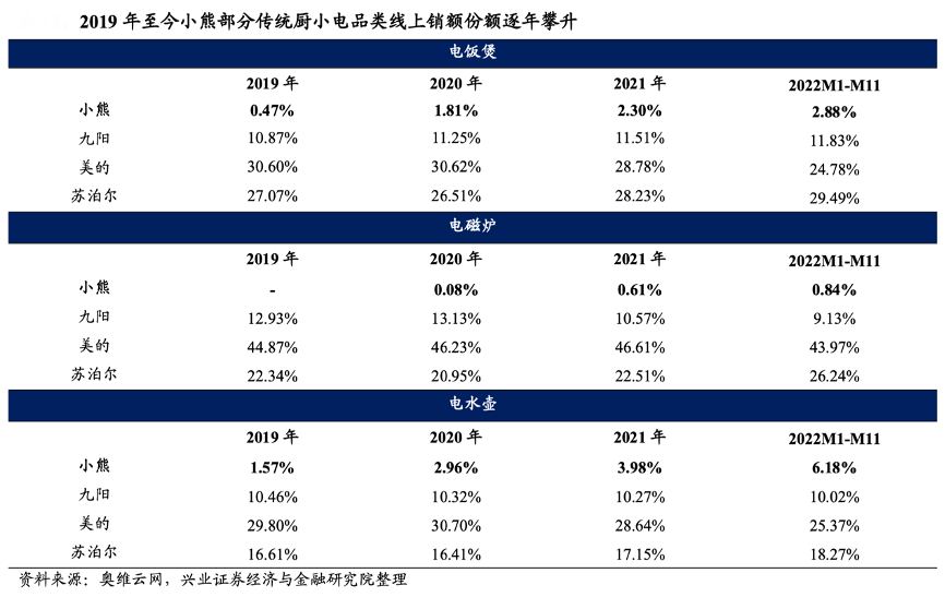 經(jīng)典案例:根據(jù)奧維云網(wǎng)、興業(yè)證券經(jīng)濟(jì)與金融研究院等綜合資訊表明,小熊產(chǎn)品多主打單人款,外觀設(shè)計(jì)偏向年輕化、時(shí)尚化,注重性價(jià)比。 以電飯煲為例,小熊產(chǎn)品主打一人食小容量,產(chǎn)品定價(jià) 150 元左右,遠(yuǎn)低于美蘇九電飯煲 200-400 元的均價(jià),形成差異化競爭。結(jié)合奧維數(shù)據(jù),2019 年至今小熊在 電飯煲、電磁爐、電水壺等傳統(tǒng)小家電品類線上銷額份額逐年攀升。