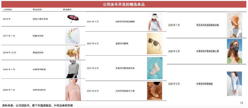 經典案例:根據公司招股書、蕉下天貓旗艦店、中信證券研究部等綜合資訊表明,蕉下打造爆款防曬傘成功入圍,產品設計直擊消費者痛點。公司開發的傘具富有“高顏值、科技感拉滿、隨身攜帶”等特征,截至2022年4月,公司有22款精選單品年銷售額超過3000萬元。