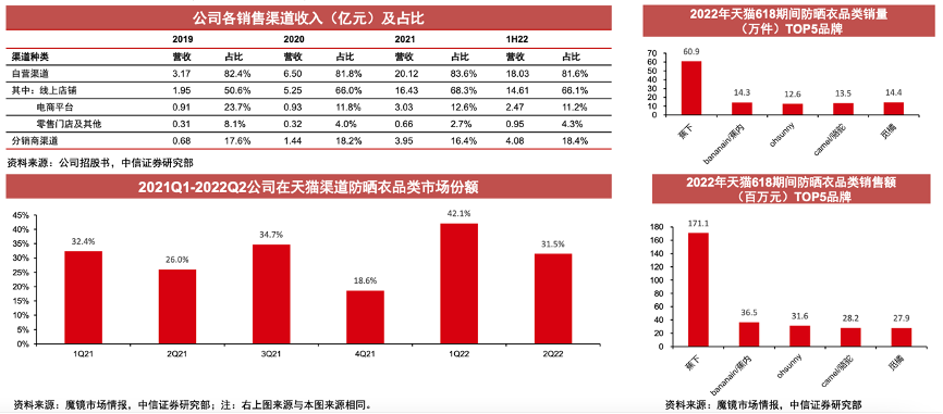 經典案例:根據公司招股書、魔鏡市場情報、中信證券研究部等綜合資訊表明,蕉下電商起盤,線上渠道表現優異,公司攜手頭部主播直播帶貨刺激消費(僅2021年618期間李佳琦直播間14次)。根據魔鏡市場情報數據,公司在2022年618期間(2022年6月1日-6月20日)防曬衣品類累計銷量達60.9萬件,銷售額達1.71億元,領先第二名約4倍。