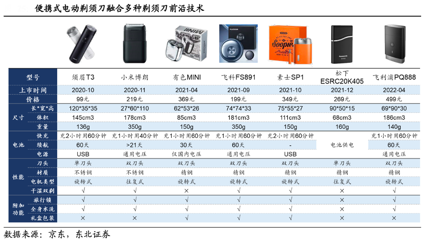 經(jīng)典創(chuàng)新案例:根據(jù)京東、東北證券等綜合資訊表明,電動(dòng)剃須刀的常規(guī)升級(jí)包括干濕雙剃、旋轉(zhuǎn)式電機(jī)、多刀頭等,而便攜式在兼容常規(guī)升級(jí)后,進(jìn)一步在外觀上開(kāi)拓 出圓柱形、方形、飛碟形等不同結(jié)構(gòu),其輕巧的體積和新穎的外形使其在中低價(jià)格 帶更加流行。根據(jù)奧維云網(wǎng)數(shù)據(jù)推算,2022 年 6 月便攜式剃須刀線(xiàn)上均價(jià)較 2021 年 1 月時(shí)提升約 36%至 145 元。