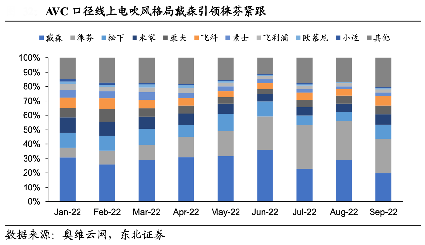 經(jīng)典創(chuàng)新案例:根據(jù)奧維云網(wǎng)、東北證券等綜合資訊表明,隨著徠芬 等新興品牌以及飛科等老國(guó)牌在高速電吹風(fēng)的布局,更合適的價(jià)位段使戴森所處的高價(jià)格帶占比下降,戴森市占率隨之下滑。根據(jù)奧維云網(wǎng)數(shù)據(jù),2022 年前三季度線(xiàn) 上電吹風(fēng)銷(xiāo)額 CR3 為 57.4%,其中戴森/徠芬/松下分別占比 29%/18.7%/9.7%。