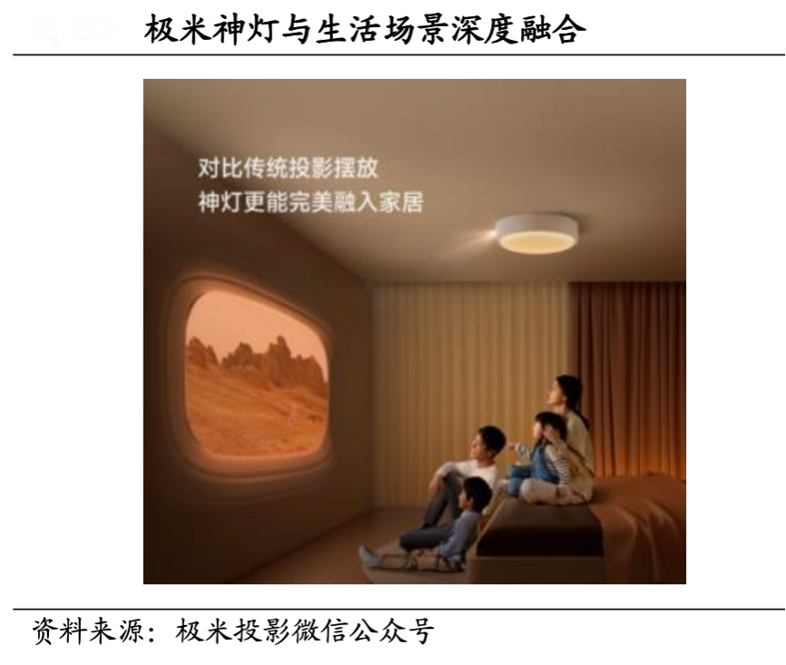 經(jīng)典案例:根據(jù)極米投影微信公眾號(hào)、國(guó)海證券研究所等綜合資訊表明,極米科技全新形態(tài)投影儀“極米神燈”2022 年 8 月進(jìn)入國(guó)內(nèi)市場(chǎng),集吸頂燈、 投影儀、音響于一體,配合推出無(wú)線 HDMI 同屏器,解決了傳輸不便、光線易遮 擋和射眼等問(wèn)題。
