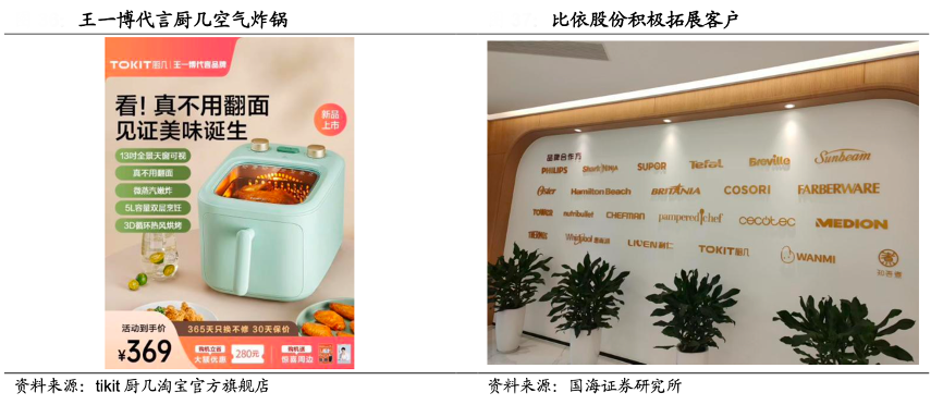 經(jīng)典案例:根據(jù)tikit廚幾淘寶官方旗艦店、國(guó)海證券研究所等綜合資訊表明,新“玩家”營(yíng)銷(xiāo)破局,代工龍頭煥發(fā)活力。美蘇九鞏固品牌優(yōu)勢(shì), 推出中高端、多功能新品,王一博代言廚幾強(qiáng)勢(shì)入局,南極人、張小泉跨界入場(chǎng)。同時(shí),“空氣炸鍋第一股”比依股份積極拓展國(guó)內(nèi)外優(yōu)質(zhì)客戶(hù)資源,2022 年與國(guó)內(nèi)蘇泊爾、小熊、山本、純米,海外飛利浦、COSORI 等優(yōu)質(zhì)客戶(hù)達(dá)成新合作,主營(yíng)空氣炸鍋代工享受行業(yè)發(fā)展紅利,業(yè)績(jī)彈性較大具備高增潛力。