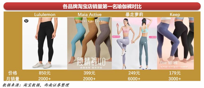 經(jīng)典案例:根據(jù)淘寶數(shù)據(jù)、西南證券等綜合資訊表明,隨著國內(nèi)品牌的崛起,及消費者審美的提高,近幾年國內(nèi)小眾的瑜伽健身服裝品牌紛紛出圈,獲得消費者喜愛。比如Maia Active也是做瑜伽褲出圈,一條瑜伽褲的均價在300- 400人民幣,比Lululemon瑜伽褲的均價便宜一半,是Lululemon 平替的較好選擇。