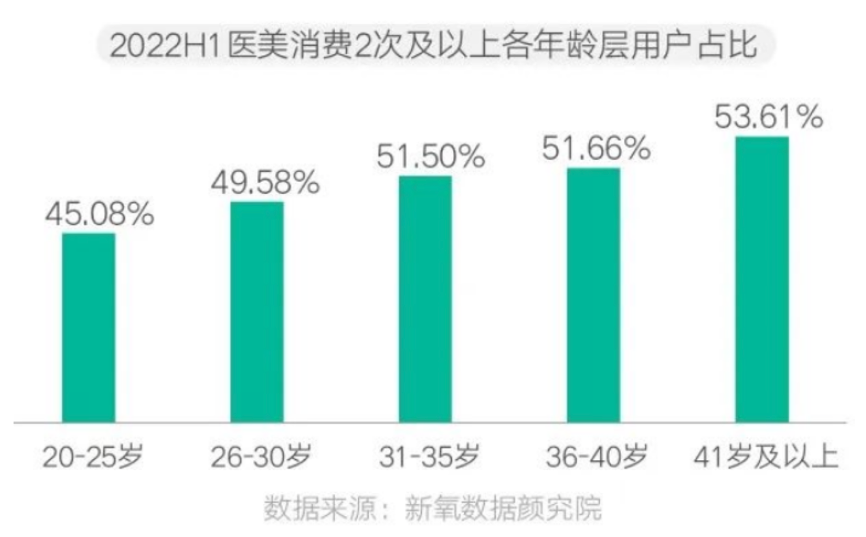 典型現象:根據新氧數據顏究院等綜合資訊表明,用戶每年的醫美消費頻次,歷來是檢驗醫美用戶信任度、忠誠度的關鍵數據。分年齡層來看,20-25歲的用戶中,2022年 H1 醫美消費 2 次及 2 次以上的用戶占比達 46.08%,26-30 歲年齡區間的用戶占比 49.58%,相比之下,31-35 歲的醫美用戶中,有 51.5%的用戶消費 2 次及 2 次以上,41 歲及以上用戶的占比更是高達 53.61%。