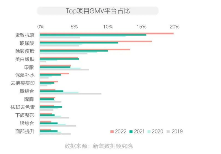 典型現象:根據新氧數據顏究院等綜合資訊表明,2022 年新氧 TOP10 項目 GMV 合計平臺占比高達 80%,說明消費者選擇醫美項目呈現顯著集中趨勢,緊致抗衰、玻尿酸、除皺瘦臉進入消費者?選的醫美項目前 3 名。