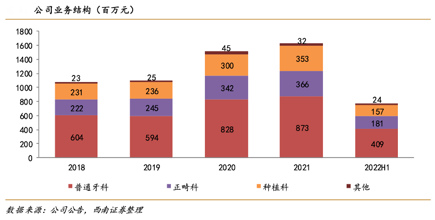 經(jīng)典案例:根據(jù)公司公告、西南證券等綜合資訊表明,通策醫(yī)療公司業(yè)務(wù) 主要分為三大板塊:普通牙科、正畸科和種植科。普通牙科主要為患者提供預防服務(wù),例如洗牙、軟組織檢查、篩查口腔疾病及其他潛在問題,以及一系列基本修復治療,包括補牙、牙冠、牙橋、牙托等。從收入端角度來看,近兩年普通牙科收入占總營收的50%,而正畸科和種植科分別占比25%。