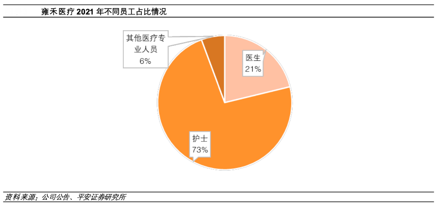 經(jīng)典案例:根據(jù)公司公告、平安證券研究所等綜合資訊表明,雍禾醫(yī)療通過手術(shù)、儀器、藥物等多種治療方式,解決患者的毛發(fā)問題。公司建立了從前后端養(yǎng)固到終端植發(fā)的全流程一站 式毛發(fā)體系。植發(fā)行業(yè)的消費者關(guān)注術(shù)后的效果和服務(wù)質(zhì)量,醫(yī)護人員的技術(shù)與規(guī)范化管理是保證服務(wù)質(zhì)量的關(guān)鍵。雍禾醫(yī) 療作為植發(fā)行業(yè)的領(lǐng)頭機構(gòu),專業(yè)團隊不斷擴大,數(shù)量從 2020 年 1134 人增長至 2021 年的 1221 人,其中醫(yī)生數(shù)量從 189 人 提 升至 259 人;護士數(shù)量從 901 人變?yōu)?nbsp;893 人;其他專業(yè)人員的數(shù)量從 44 增長至 69 人。