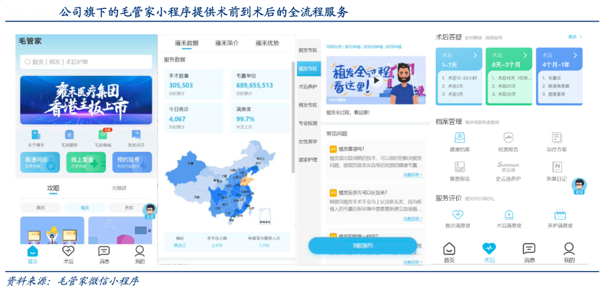 經(jīng)典案例:根據(jù)毛管家微信小程序、華創(chuàng)證券等綜合資訊表明,雍禾公司致力于推動就醫(yī)服務(wù)標準化,在微信小程序推出毛管家小程序,除了提供科 普服務(wù)、咨詢服務(wù)、預(yù)約服務(wù)、商品購買商城等,還構(gòu)建了健康檔案管理和發(fā)友心得交 流等平臺,基本搭建了從術(shù)前到術(shù)后的全流程數(shù)據(jù)管理體系。截至 2021 年 12 月,毛管 家已擁有81.1 萬名注冊用戶。