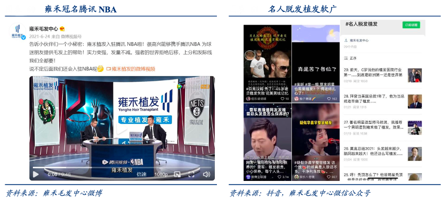 經典案例:根據雍禾毛發中心、抖音、雍禾毛發中心微信公眾號、華創證券等綜合資訊表明,現今行業獲客成本仍然高企,2018~2021H1 雍禾公司銷售費用率平均值為 51.3%,處于較高水平。2021H1 公司冠名騰訊 NBA 賽事并投放小視頻等,銷售費用率提高至 54.8%,凈利率水平隨之拉低。