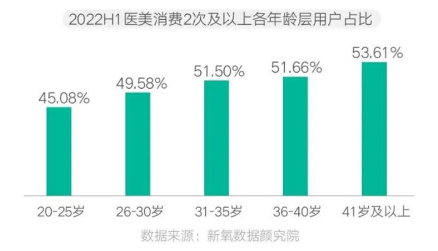 典型現象:根據新氧數據顏究院等綜合資訊表明,分年齡層來看,20-25 歲的用戶中,2022 年 H1 醫美消費 2 次及 2 次以上的用 戶占比達 46.08%,26-30 歲年齡區間的用戶占比 49.58%,相比之下,31-35 歲的醫 美用戶中,有51.5%的用戶消費 2 次及 2 次以上,41 歲及以上用戶的占比更是高 達 53.61%。