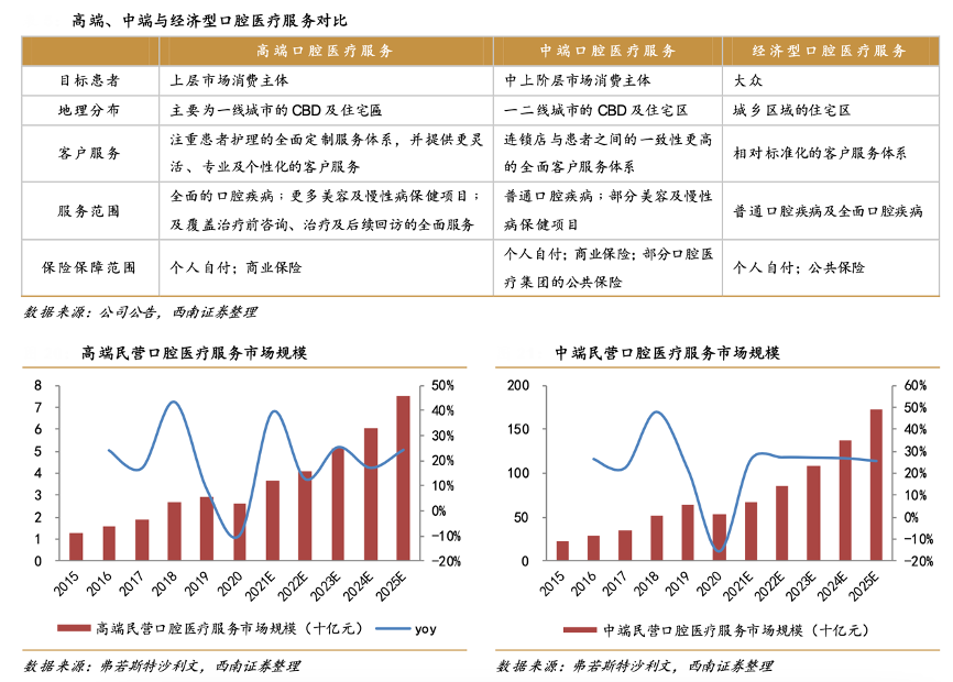 經典案例:根據公司公告、弗若斯特沙利文、西南證券等綜合資訊表明,高端口腔醫療服務以更高的醫療標準與更佳的服務設施與私密度滿足成熟消費者的期望。中端口腔醫療服務提供商通常以連鎖店的形式提供服務,能夠搭建全面 客戶服務體系。高端民營口腔醫療服務市場在 2012 年為 12.9 億元,根據 沙利文預測,將于 2025 年達到 74.9 億元,CAGR 達 14.5%。