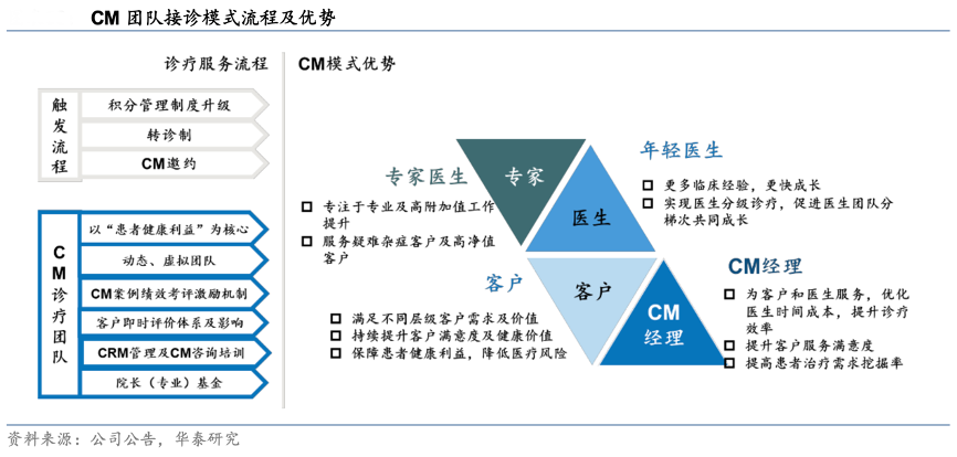 經典案例:根據公司公告、華泰研究等綜合資訊表明,通策醫療公司以醫生為核心生產力進行資源配置,積極推行以患者為中心的 CM(Case Manager)團隊接診模式,通過分工將醫生時間更多分配至專業化程序,以實現分類管理、精準服務的效果。