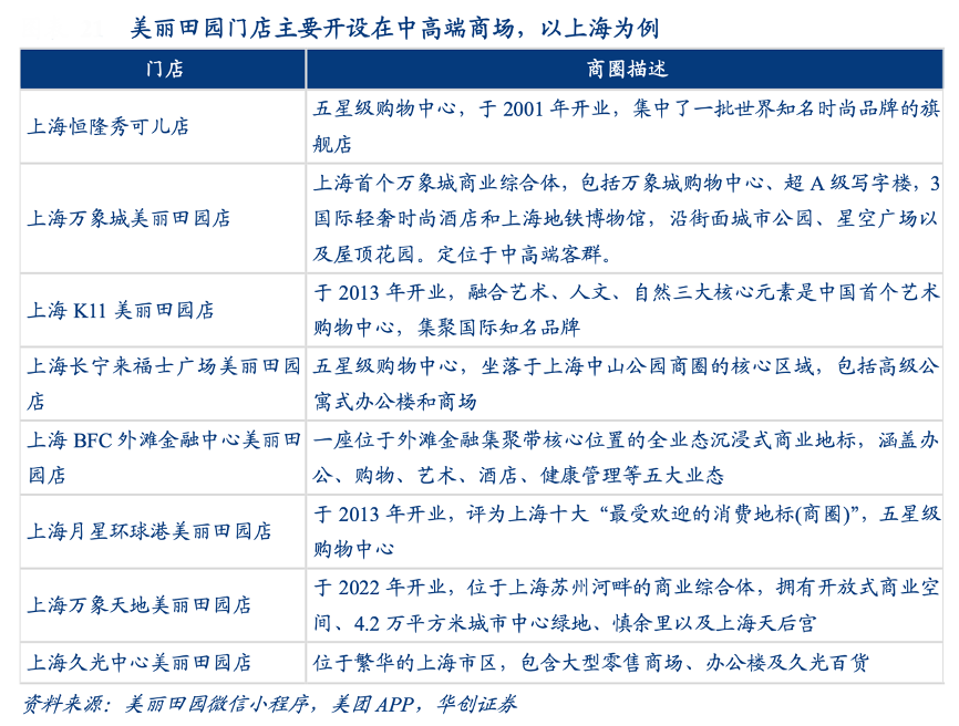 經(jīng)典案例:根據(jù)美麗田園微信小程序、美團(tuán)APP、華創(chuàng)證券等綜合資訊表明,美麗田園布局中高端商場,定位中高端客戶,以上海為例,美麗田園在恒隆廣場、萬象城、K11、BFC 外灘金融中心、久光中心等高端商場均有布局,基于此,美麗田園 ASP 較高,2022 年為 943 元。