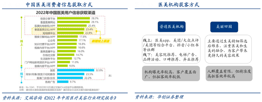 經(jīng)典案例:根據(jù)艾瑞咨詢、華創(chuàng)證券等綜合資訊表明,美麗田園一般求美者獲取信息的途徑包括:1)線上的社媒平臺、垂直醫(yī)美網(wǎng)站/APP、醫(yī)美機(jī)構(gòu)網(wǎng) 站等,2)線下的醫(yī)院/門診部/診所,親朋好友的推薦,各類廣告。公司深耕生美 30 年, 年約服務(wù)近 30 萬消費(fèi)者,擁有超 10 萬的活躍會員(2022 年直營 7.6 萬+加盟店 3.0 萬, 合計 10.6 萬),生美活躍會員年均到店次數(shù)約為 10 次,與生美會員之間建立起了高強(qiáng)度的信任和情感價值,雖獲客覆蓋范圍有限但更為精準(zhǔn)。