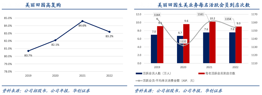 經典案例:根據公司招股書、公司年報、華創證券等綜合資訊表明,細致運營下,美麗田園復購率穩定在80%+,每名活躍會員到店次數約 9~10 次,活躍會員的 ASP 約 1150 元,高于生美整體約 950 元的 ASP,舉例來看,2021 年活躍會員到店次數占比約77.6%,貢獻的收入占比約95.0%。