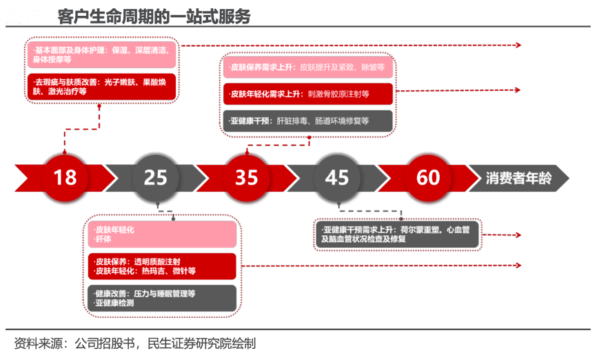 經典案例:根據公司招股書、民生證券研究院等綜合資訊表明,美麗田園公司自設立起,聚焦于日常面 部及身體護理服務;2011年拓展到能量儀器與注射服務領域,2022 年貢獻 37.9% 營收;2018 年捕捉到亞健康問題下與日俱增的抗衰需求,開始發展抗衰醫學服務,2022 年貢獻營收 4.2%。截至 2022H1,公司一站式健康與美麗管理服務涵蓋 3 項服務類別、47 項具體項目、800+SKU,跨越客戶全生命周期,提供一站式服務。