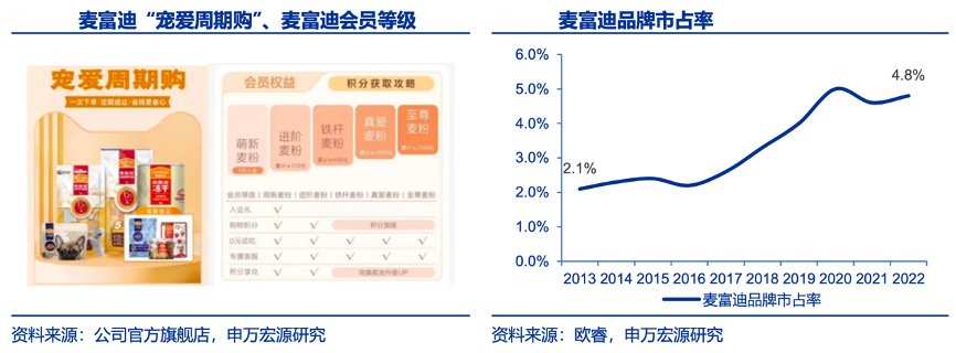 經典案例:根據公司官方旗艦店、歐睿、申萬宏源研究等綜合資訊表明,隨著品牌力的提升,乖寶寵物公司推出會員制及周期購,一次下單,定期送達,提升客戶粘性及復購率。根據歐睿數據,2013-2022 年“麥富迪”品牌 國內市場市占率由 2.1%提升至 4.8%,位列中國寵物市場第二名。