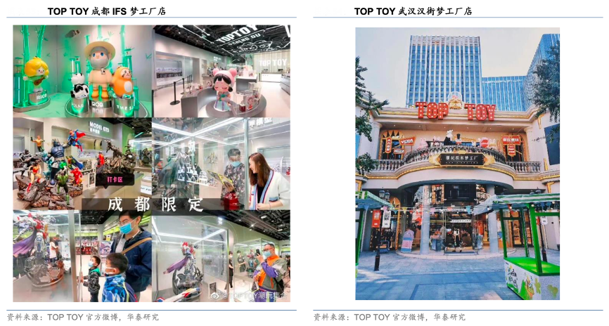 經典案例:根據TOP TOY官方微博、華泰研究等綜合資訊表明,TOP TOY 夢工廠店通過融入當地特色元素 與自身的品牌特征和文化,推出特色主題門店。2023 年 9 月,TOP TOY 在上海迪士尼小 鎮開設以“潮玩機械廠”為設計理念的小鎮店,匯聚上百款知名 IP,為消費者提供 600+SKU 的創新產品。