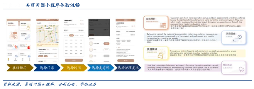 經典案例:根據美麗田園小程序、公司公告、華創證券等綜合資訊表明,當前美麗田園公司數據平臺涉及區域發展模型、門店運營支持模型、 客戶分析模型、員工發展模型,其中客戶關系管理系統中涵蓋 96 項客戶標簽,用戶畫像 完整,利于挖掘客戶需求(如生美和醫美相互賦能)和喚醒沉睡客戶。2020 年初公司上線“美田在線”小程序,涵蓋線上預約、信息發布、營銷活 動、直播體驗、線上商城、服務回訪等,實現從預約→消費→服務反饋的閉環。