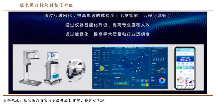 經典案例:根據雍禾醫療首次投資者開放日交流、德邦研究所等綜合資訊表明,雍禾是首家建立數據分析系統的民營毛發服務提供商,且是截止目前唯一一家可實時獲取患者人數、植發手術數量及毛囊移植數量資料的連鎖醫療機構。數據展示提升了醫療服務的透明度,進而提升患者治療體驗;另一方面通過分析運營所收集的數據,公司可迅速準確的發現并滿足患者需求,有效管理客戶情況,實時精準廣告營銷,并對患者的需求做出預測以及告知診斷及治療過程。