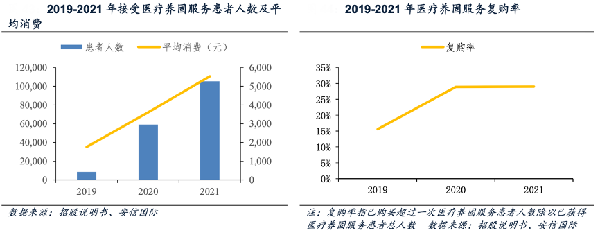 經(jīng)典案例:根據(jù)招股說明書、安信國際等綜合資訊表明,雍禾醫(yī)療公司收購英國健發(fā)品牌史云遜后開始進軍醫(yī)療養(yǎng)固業(yè)務,經(jīng)過多年的發(fā)展,協(xié)同效應成效顯現(xiàn),2021 年植發(fā)患者手術后選擇進行醫(yī)療養(yǎng)固服務的轉化率為44.6%,醫(yī)療養(yǎng)固服務后繼續(xù)選擇植發(fā)手術的轉化率為4.1%。因醫(yī)療養(yǎng)固服務非手術且更易負擔,受到越來越多消費者的青睞,接受醫(yī)療養(yǎng)固服務的患者人數(shù)、人均消費、復購率不斷攀升,其中,復購率從 2019 年的 15.6%增長至 2021 年的 29.0%,說明消費者粘性不斷提高。