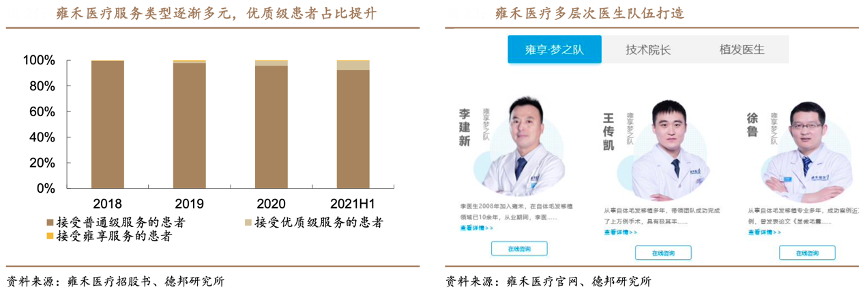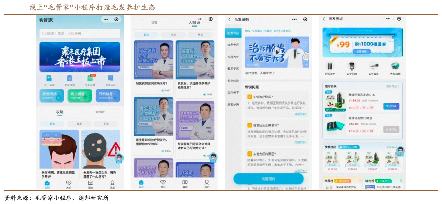 經典案例:根據毛管家小程序、德邦研究所等綜合資訊表明,雍禾醫療公司積極推進在線醫療服務,已建立一支在線醫療團隊,在微信小程序上開發“毛管家”小程序,擁有超 81 萬名注冊用戶,可為患者進行植發手術介紹、查詢醫生執照及價格信息等,可實時上傳患者病歷等文件,從而提供便捷專業的在線咨詢、術后復查服務。