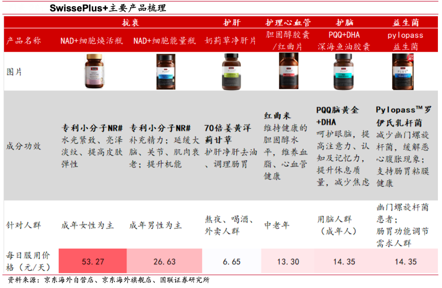 經(jīng)典案例:根據(jù)公司官網(wǎng)、京東海外旗艦店、京東海外自營店、國聯(lián)證券研究所等綜合資訊表明,Swisse Plus+品牌定位 35-50 歲精 英人群,產(chǎn)品原料更高端、營養(yǎng)素功效性更強(qiáng),主要產(chǎn)品有抗衰概念產(chǎn)品 NAD+煥 活、能量瓶,護(hù)肝產(chǎn)品奶薊草片、護(hù)理心血管健康的紅曲片、護(hù)腦的 PQQ 腦黃金以 及調(diào)節(jié)幽門螺旋桿菌的 Pylopass 益生菌產(chǎn)品。其中京東評價數(shù)較高的為護(hù)理心血管、護(hù)腦及護(hù)肝產(chǎn)品,中老年及消費(fèi)力強(qiáng)而生活不規(guī)律的精英白領(lǐng)或?yàn)槟繕?biāo)群體。