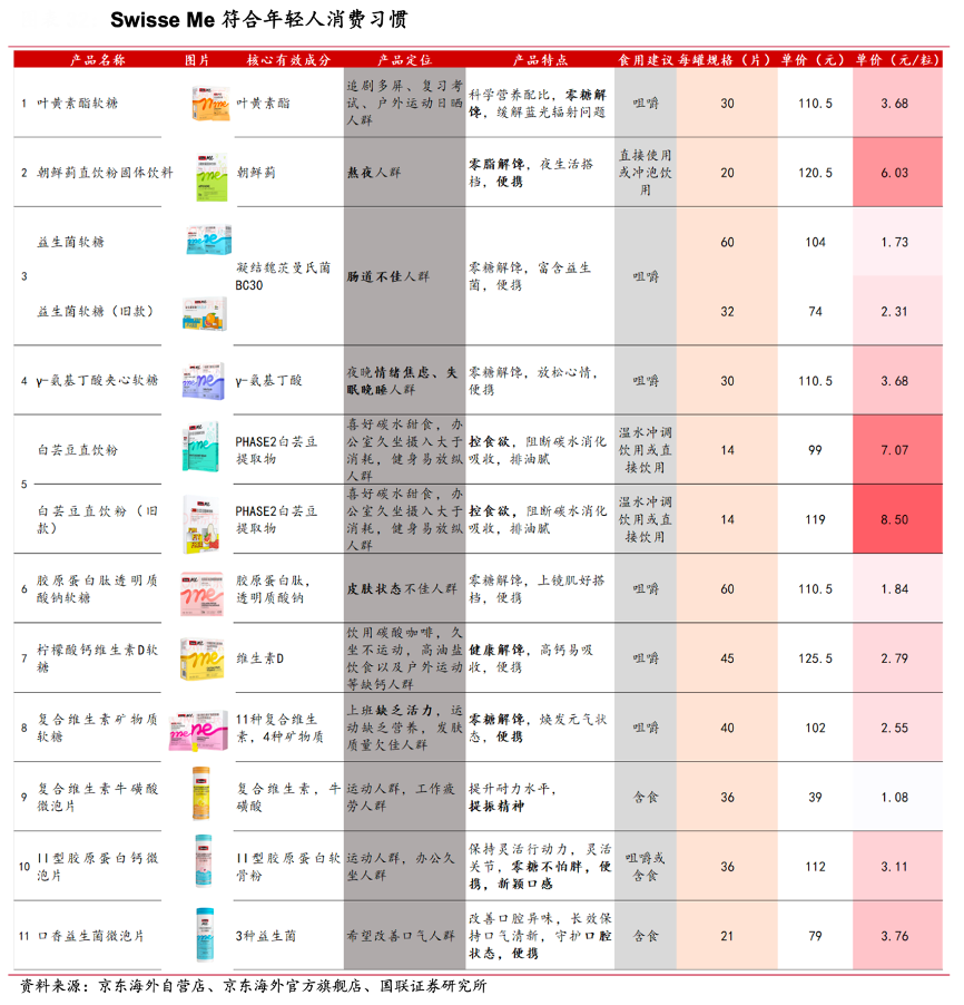 經(jīng)典案例:根據(jù)京東海外自營店、京東海外官方旗艦店、國聯(lián)證券研究所等綜合資訊表明,Swisse Me 品牌在產(chǎn)品設(shè)計及用法功效上則更為貼合年輕消費(fèi)者的需求。功效上,該品牌更側(cè)重護(hù)眼護(hù)肝、調(diào)節(jié)情緒、調(diào)理腸道、減肥瘦身、提振精力及護(hù)理皮膚。年輕消費(fèi)者粘性較低、愛好嘗新、不易堅持,而該品牌單價低、劑量小的特點(diǎn) 或進(jìn)一步降低了消費(fèi)者嘗新成本,用豐富的 SKU 對沖了單個產(chǎn)品粘性較低的風(fēng)險。