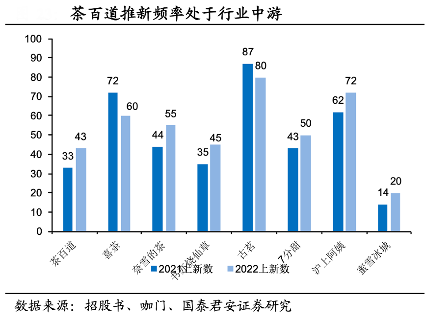 經(jīng)典案例:根據(jù)招股書、咖門、國泰君安證券研究等綜合資訊表明,茶百道公司持續(xù)對消費(fèi)者口味喜好的變化趨勢進(jìn)行調(diào)研與預(yù)判,通過每隔幾個月即上新季節(jié)限定款或區(qū)域限定款產(chǎn)品的方式持續(xù)為消費(fèi)者帶來新穎、驚喜的茶飲體驗。2023 年,茶百道開發(fā)出約 250 多款產(chǎn)品,并推出了 48 款新 品,升級了 13 款產(chǎn)品,飽受消費(fèi)者好評。
