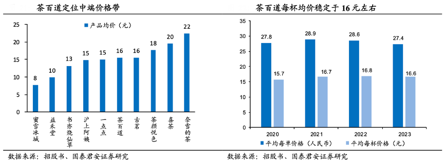 經(jīng)典案例:根據(jù)招股書、國泰君安證券研究等綜合資訊表明,茶百道定位中端價格帶,性價比優(yōu)勢顯著。茶百道每杯均價穩(wěn)定在 16 元左右,原材料環(huán)節(jié)嚴(yán)格把控,多為原葉和鮮果,產(chǎn)品力穩(wěn)定。