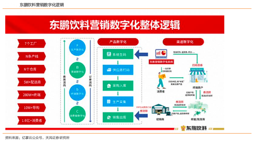 經典案例:根據億掌云公眾號、天風證券研究所等綜合資訊表明,2015 年,東鵬推出一物一碼,2016 年公司推出二維碼微信現 金紅包,2018 年推出一元樂享的換購。消費者憑有獎蓋到門店可 1 元加購一瓶東鵬特飲,門店可以獲得用戶的 1 元換購金和品牌獎勵的 1.58 元現金紅包+返貨券?;谝晃镆淮a,東鵬以連接 C 開始,影響小 b,解決動銷,連接小 b,推動大 B(渠道商),進而構建起營銷 數字化體系。
