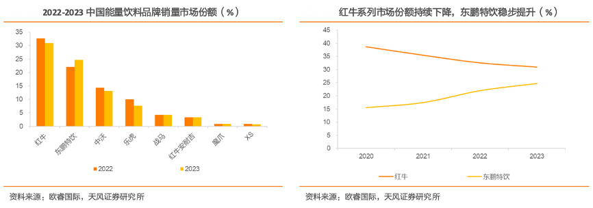 經典案例:根據歐睿國際、天風證券研究所等綜合資訊表明,我國能量飲料行 業整體集中度高,但由于紅牛商標權之爭尚未結束,增長受限,給與了其他企業更大發展空間。其中以東鵬特飲的增長最為明顯,從 2020 年的 15.6%增長至 2023 年 24.7%,與紅牛、中沃、 樂虎等競品相比增速顯著,有望打破現有市場格局 。