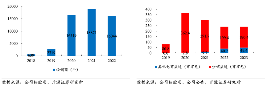 經(jīng)典案例:根據(jù)公司招股書、公司公告、開源證券研究所等綜合資訊表明,巨星傳奇公司通過 IP 賦能私域流量轉(zhuǎn)化,推動消費(fèi)者向分銷商及 KOC 裂變。公司借助昆山汀奢分銷產(chǎn)品的分銷代理向相關(guān)經(jīng)銷商提供在線銷售和營銷方面的輔助及培訓(xùn),由此建立有效的分銷網(wǎng)絡(luò),2022年公司在全國擁有超過 16000 個(gè)經(jīng)銷商。