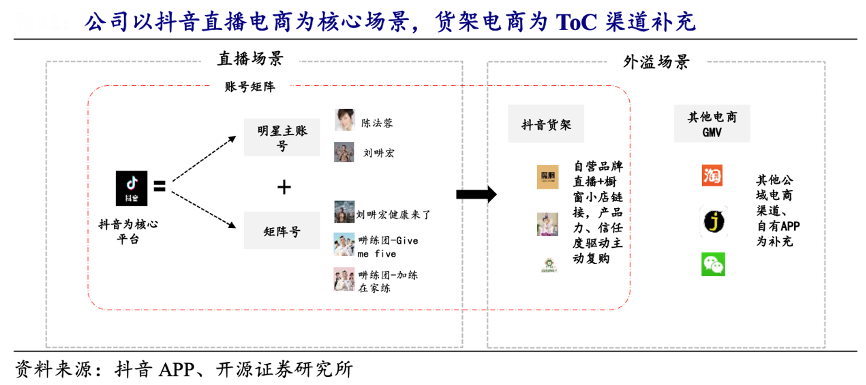 經(jīng)典案例:根據(jù)抖音APP、開源證券研究所等綜合資訊表明,巨星傳奇公司通過自有明星 IP 劉畊宏、陳法蓉抖音矩陣號直播帶貨為核心場景,抖音貨架&自有 APP、其他電商渠道承接外溢復(fù)購需求,積極招募和培育外部 KOL(部分 KOC 通過運(yùn)營社交平臺賬號,有潛力成為腰尾部 KOL)參與品牌公域推廣。2023 年公司通過直播和貨架電商渠道銷售自有品牌金額為 4940 萬元,同比增長 21.4%,占比提升至 21%。