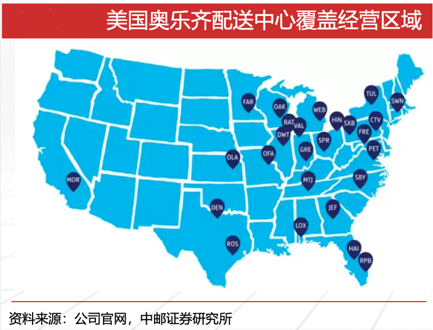 經(jīng)典案例:根據(jù)公司官網(wǎng)、中郵證券研究所等綜合資訊表明,以美國奧樂齊為例,根據(jù)公司官網(wǎng)奧樂齊在美國建立22個(gè)配送中心,基本每個(gè)超市所在州均有配送中心。短鏈配送體系使快速的商品周轉(zhuǎn)成為可能,降低公司庫存成本。