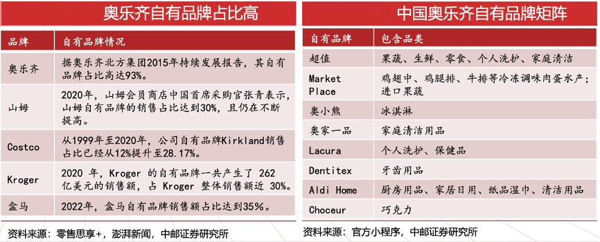 經(jīng)典案例:根據(jù)零售思享+、澎湃新聞、官方小程序、中郵證券研究所等綜合資訊表明,異于一般商超20%-30%的自有品牌率,奧樂齊自有品牌占比高達(dá)93%。以中國奧樂齊為例,目前中國奧樂齊主打“超值”品牌系列,伴隨奧小熊、奧家一品等細(xì)分品類自有品牌,共同構(gòu)成了中國奧樂齊“低 價(jià)+高性價(jià)比”的自有品牌矩陣。