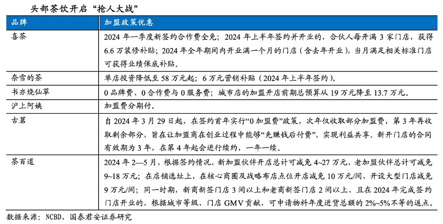 經(jīng)典案例:根據(jù)NCBD、國泰君安證券研究等綜合資訊表明,2024年以來,頭部連鎖茶飲品牌通過 調(diào)整加盟政策,進(jìn)一步降低加盟門檻,開啟“搶人大戰(zhàn)”。頭部品牌發(fā)力爭奪市場份額,有望憑借規(guī)模優(yōu)勢、供應(yīng)鏈能力以及運(yùn)營能力加速尾部 獨(dú)立茶飲店出清。