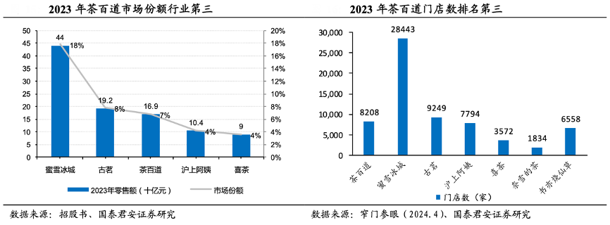 經(jīng)典案例:根據(jù)招股書、窄門參眼(2024.4)、國泰君安證券研究等綜合資訊表明,截至 2023 年,茶百道是全國門店 數(shù)排名第三的茶飲企業(yè),僅次于蜜雪冰城和古茗。按零售額計,茶百道也是全國零售額排名第三的茶飲企業(yè),市場份額約為 7%。頭部茶飲連鎖 企業(yè)中,除了蜜雪冰城定位平價市場,其余品牌包括茶百道、古茗、滬 上阿姨等,大多定位 8-20 元中端價格帶。