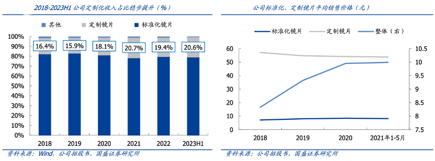 經典案例:根據wind、公司招股書、國盛證券研究所等綜合資訊表明,定制化鏡片對廠商的設計&生產制造&服務能力提出較高要求、壁壘較高??堤啬凸径ㄖ苹R片收入占比逐年穩步提升,2018- 2022 公司定制化收入從 1.40 億元增長至 3.03 億元(CAGR 為 21.3%),增速快于標準 化鏡片(CAGR 為 15.3%)。截至 2023H1,定制化占比達到 20.6%。