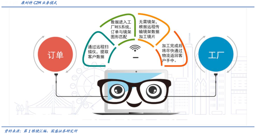 經典案例:根據第1眼鏡匯編、國盛證券研究所等綜合資訊表明,康耐特光學依托 C2M 新業態模式滿足終端客戶一站式需求。C2M 模式指工廠直面終端銷售,主要客戶為眼科醫院/眼鏡店/診所/連鎖店/大型商超/在線網店。公司遠程系統建設完善,用戶在線訂單系統下單后,信息直接傳輸至公司軟件&生產設備;同時也可以和客戶自有系統打通,提升客戶下單便捷性&交付效率。