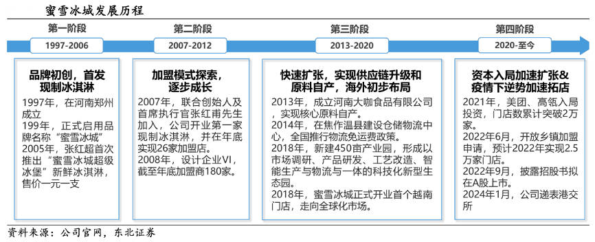 經典案例:根據公司官網、東北證券等綜合資訊表明,2017年,蜜雪冰城公司推出現磨咖啡品牌“幸運咖”;2020 年門店數破萬家,2021 年美團、高領等資本入局,門店數突破 2 萬家,同年公司最大的生產基地于河南投入運營。