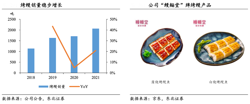 經典案例:根據公司公告、京東、東北證券等綜合資訊表明,天馬科技公司成功打造了“鰻鱺堂”烤鰻品牌,以蒲燒烤鰻和白燒烤鰻產品為主,其中蒲燒烤鰻暢銷海內外 60 多個國家和地區,接連榮獲位于比利時布魯塞爾的國際風味 評鑒所 2021 及 2022“頂級美味獎章”三星獎等多個國際國內獎項,品牌勢能逐漸積累。