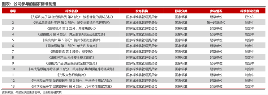 經(jīng)典案例:根據(jù)偉星光學(xué)招股說明書、民生證券研究院等綜合資訊表明,截至截至2023年6月30日,偉星光學(xué)公司累計作為起草單位參 與11項國家標(biāo)準(zhǔn)制定,其中《半成品眼鏡片毛坯第2部分:漸變焦眼鏡片毛坯規(guī)范》為公司主導(dǎo)項目。