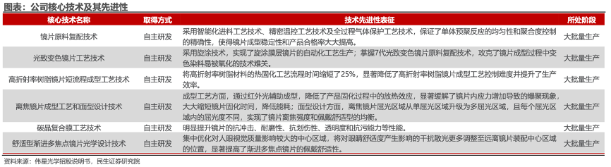 經(jīng)典案例:根據(jù)偉星光學(xué)招股說明書、民生證券研究院等綜合資訊表明,截至2022年底,偉星光學(xué)公司已形成包含六項核心技術(shù)的技術(shù)矩陣,打造了獨特的技術(shù)優(yōu)勢,例如公司近百種樹脂鏡片原料復(fù)配方案實現(xiàn)快速高效響應(yīng)市場需求;光致變色鏡片工藝技術(shù)所制產(chǎn)品具有光致變色響應(yīng)速度快、色彩豐富、耐老化壽命長、底色淺、變色程度深等特點。公司以六大核心技術(shù)為生產(chǎn)基礎(chǔ),通過核心技術(shù)的產(chǎn)業(yè)化應(yīng)用保證公司鏡片產(chǎn)品性能的優(yōu)越性以及質(zhì)量的穩(wěn)定性。