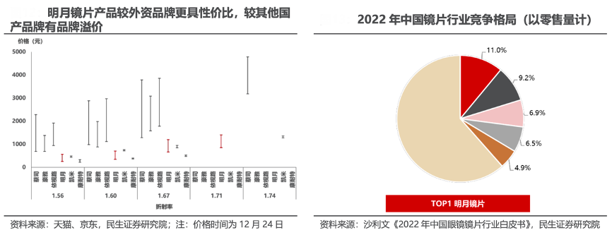 經(jīng)典案例:根據(jù)天貓、京東、沙利文《2022年中國眼鏡片行業(yè)白皮書》、民生證券研究院等綜合資訊表明,在產(chǎn)品力不弱于外資品牌的基礎(chǔ)上,明月鏡片核心產(chǎn)品較外資具備更強(qiáng)性價(jià)比,能為消費(fèi)者在有限預(yù)算下提供更優(yōu)選擇。根據(jù)沙利文《2022 年中國眼鏡鏡片行業(yè)白皮書》,2022年,按零售量計(jì)算,明月鏡片以 11%的市占率位列行業(yè)第一。