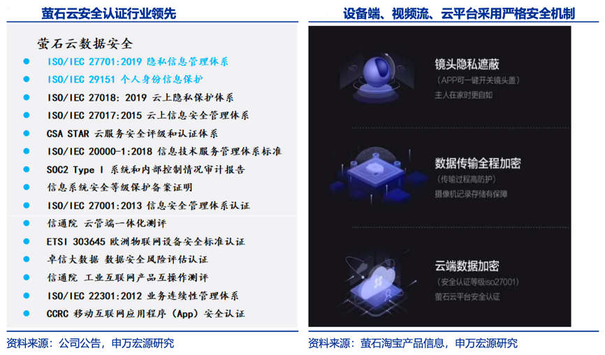 經典案例:根據公司公告、螢石淘寶產品信息、申萬宏源研究等綜合資訊表明,螢石對云安全投入較高,2017年是業內首家通過 ISO27001 安全認證的物聯網云平臺,2021年主動日均安全排查近 360 萬次,公司共拿到 15 項安全認證;同時,其自主研發云安全技術,提供自研輕量級安全傳輸方案和媒體鏈路安全傳輸方案。