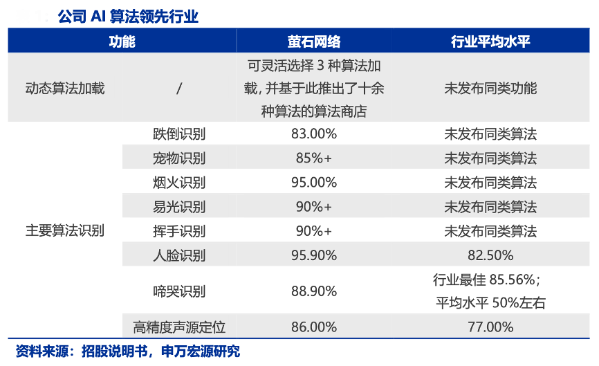 經典案例:根據招股說明書、申萬宏源研究等綜合資訊表明,螢石公司打造算法商店,滿足兒童陪伴、老人看護、寵物陪護等智能家居場景下的剛性監測需求。用戶可以根據應用場景的需要自主選擇 AI 算法,以快速定制家居或類家居場景的解決方案,公司在 AI 算法上領先行業平均水平。