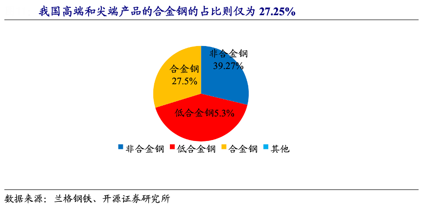 經典案例:根據蘭格鋼鐵、開源證券研究所等綜合資訊表明,特鋼的應用領域十分廣泛,包括國防、電力、石油化工、核電、汽車等。在我國特鋼產品中,2023Q1-3,在重點優特鋼產品結構中,中低端產品主要集中在非合金鋼和低合金鋼上,占比高達 72.5%。而集中在高端和尖端產品的合 金鋼的占比則僅為 27.25%。